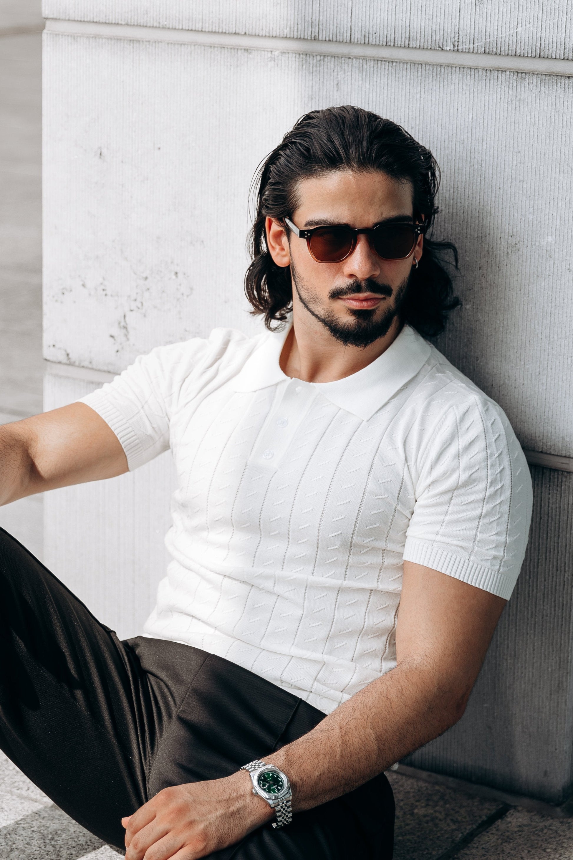 This black knit polo combines classic design with a sleek, contemporary edge, making it a versatile piece for both casual and semi-formal occasions. Its refined texture and tailored fit provide a polished look, while the buttoned placket adds a subtle, sophisticated detail. Perfect for styling with chinos, trousers, or even jeans.