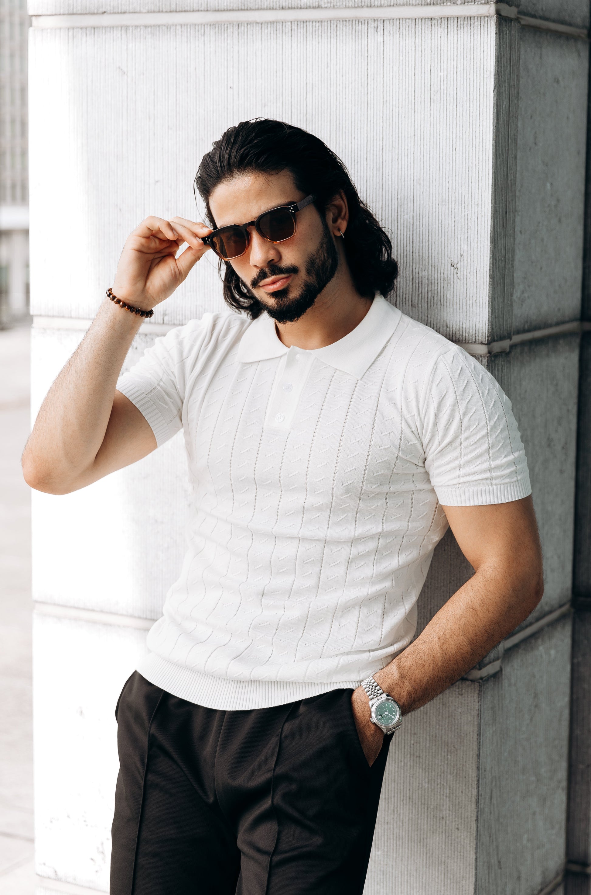 - Buttoned placket: Adds a touch of formality to the casual polo style.
