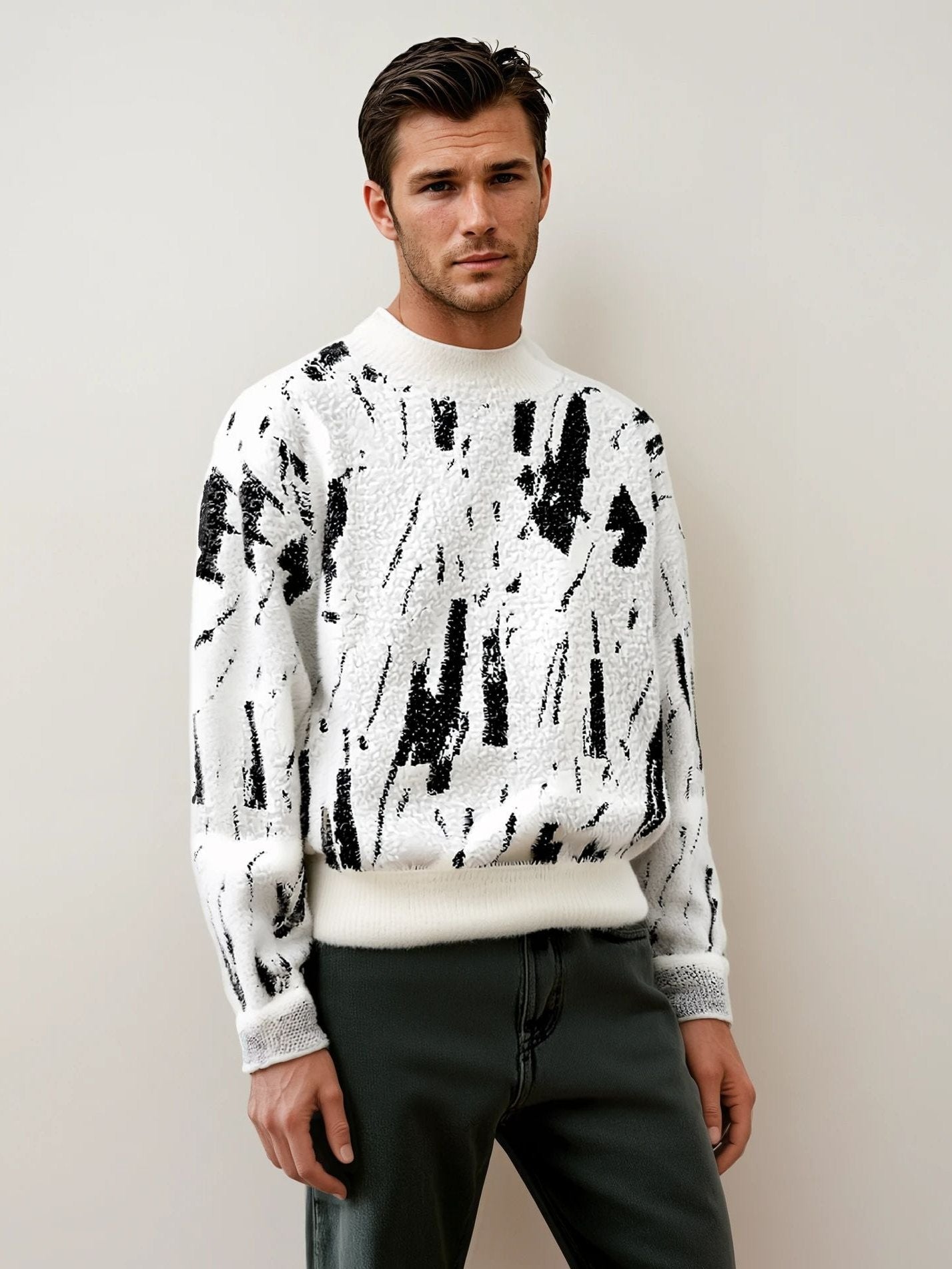 This abstract-patterned sweater combines contemporary style with comfort, making it a standout piece for any wardrobe. Its bold black-and-white design adds a modern flair, while the textured knit ensures warmth and visual interest. Perfect for casual or semi-formal settings, this versatile sweater pairs effortlessly with a range of outfits, letting you express your individuality with ease.